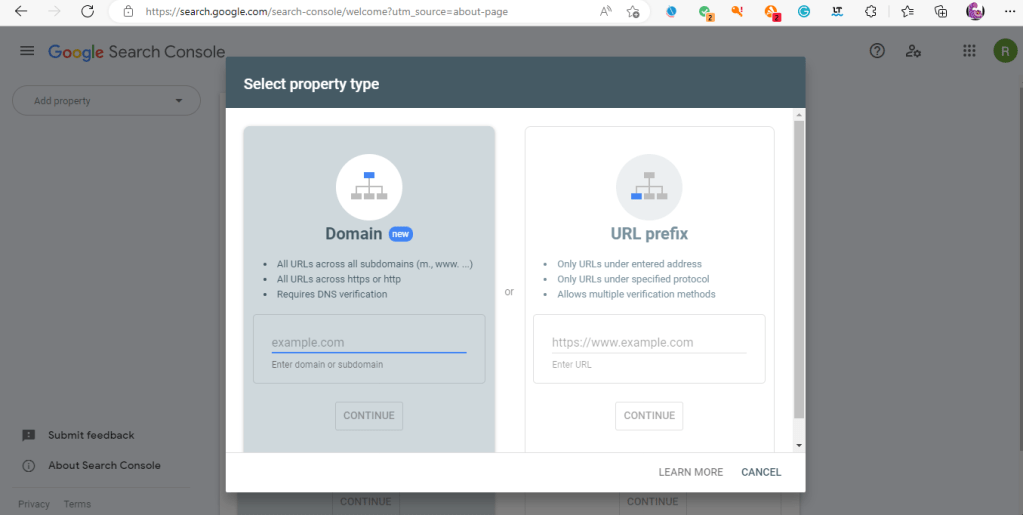 This will add your entire website to Google Search Console, allowing you to monitor and manage its performance.