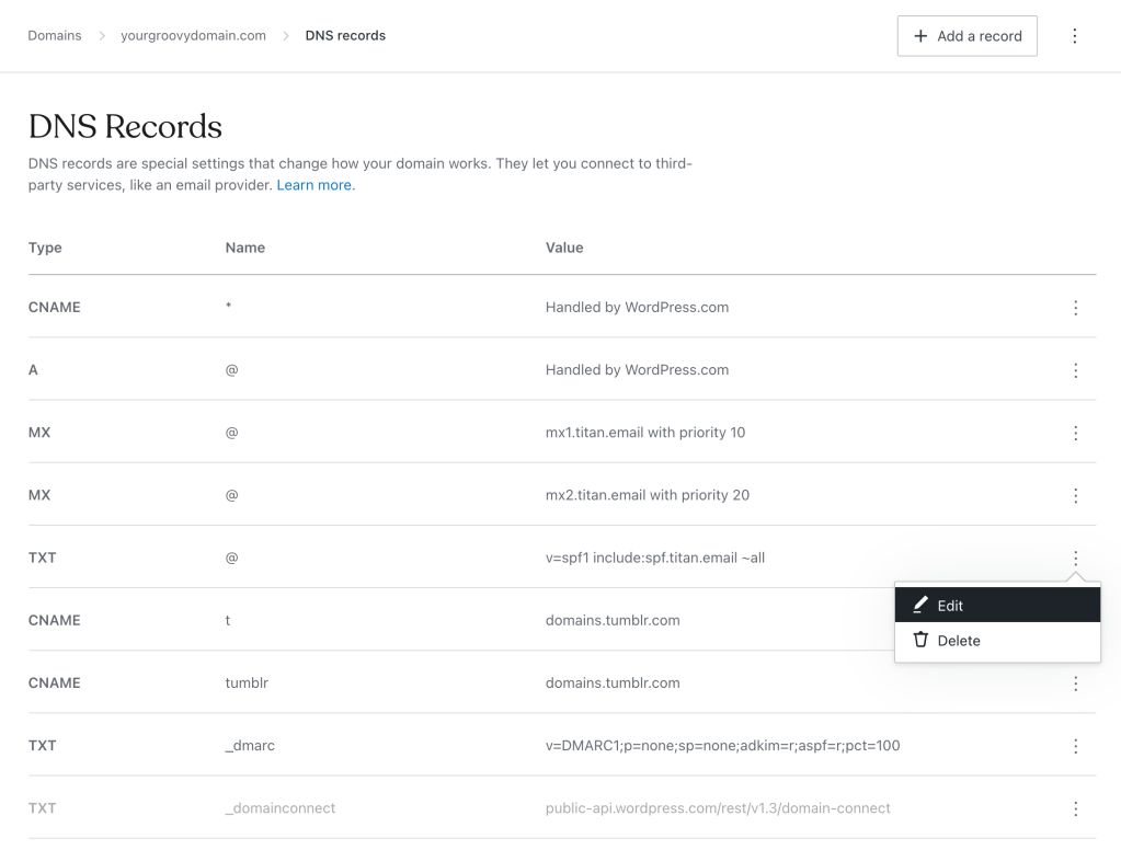 To edit or remove an existing DNS record, click the three dots next to an existing record and select either Edit or Delete.