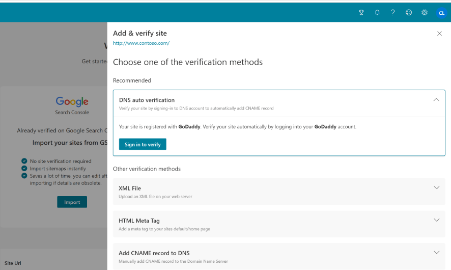 Bing Webmaster Tools supports the Domain Connect standard, streamlining the verification process for site owners. With Domain Connect, Bing Webmaster Tools can automatically detect your DNS provider and handle the CNAME insertion process. To verify your site ownership using Domain Connect: