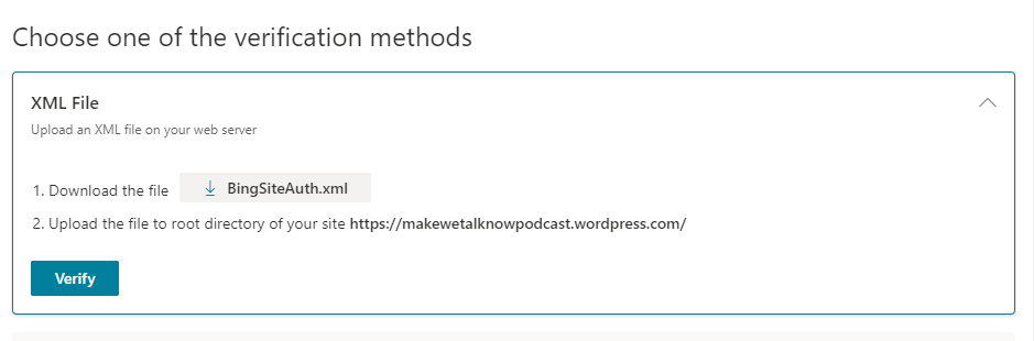 Another verification option involves downloading the BingSiteAuth.xml file, which contains your unique ownership verification code. To complete the verification process: