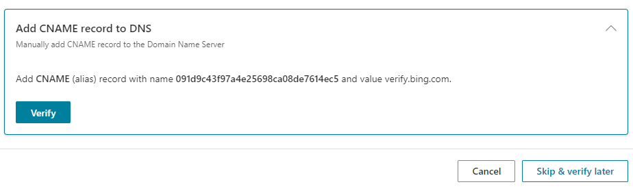 Bing will then be able to verify your site ownership by detecting the updated CNAME record.